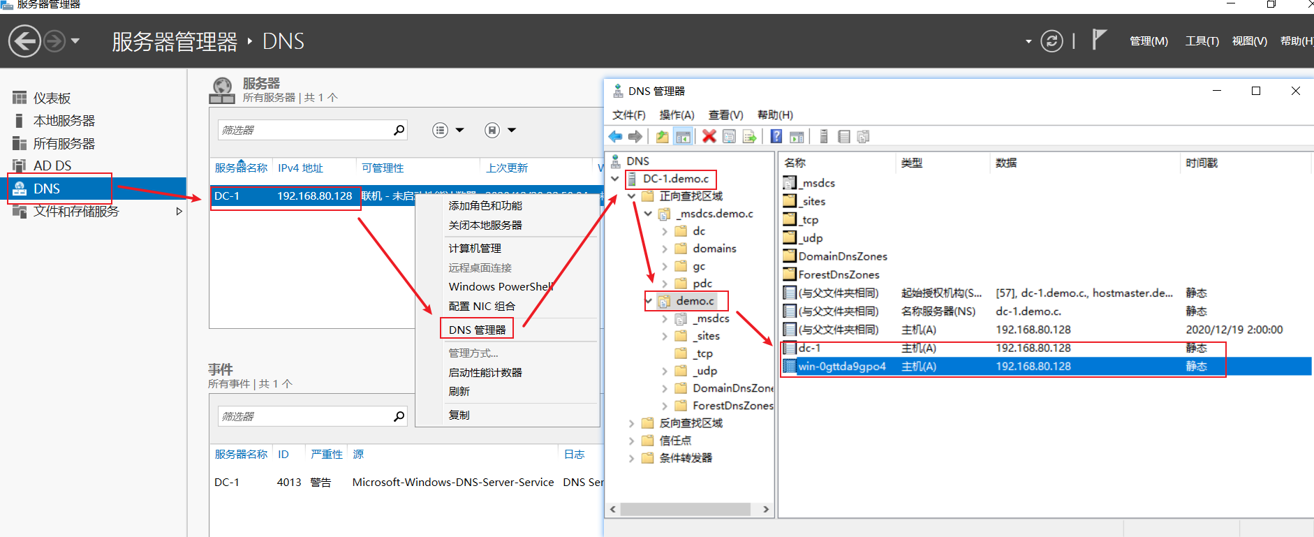 重启后我们点击服务器管理器中的 DNS,查看 DC-1 的 A 记录是否已经生效,在正向查找区域里我们可以看到 DC-1 的 A 记录已经生效了,但是之前旧的计算机名 A 记录还在,我们可以右键把它删除掉